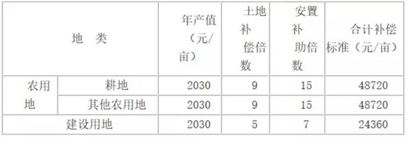 2.耕地:土地补偿费标准为48720元/亩,青苗补偿费标准为1100元/亩。总计耕地补偿标准为49820元/亩。