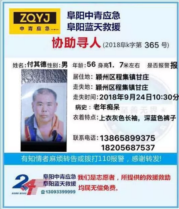 前几天,朋友圈都在找这样一个老人他叫付其德,家住颍州区程集镇甘庄的今年56岁,有些老年痴呆,9月24日,他走失了。今天早上,老人被发现。不幸的是,老人已经身亡。9月27日早上八点多,阜阳蓝天救援队接阜